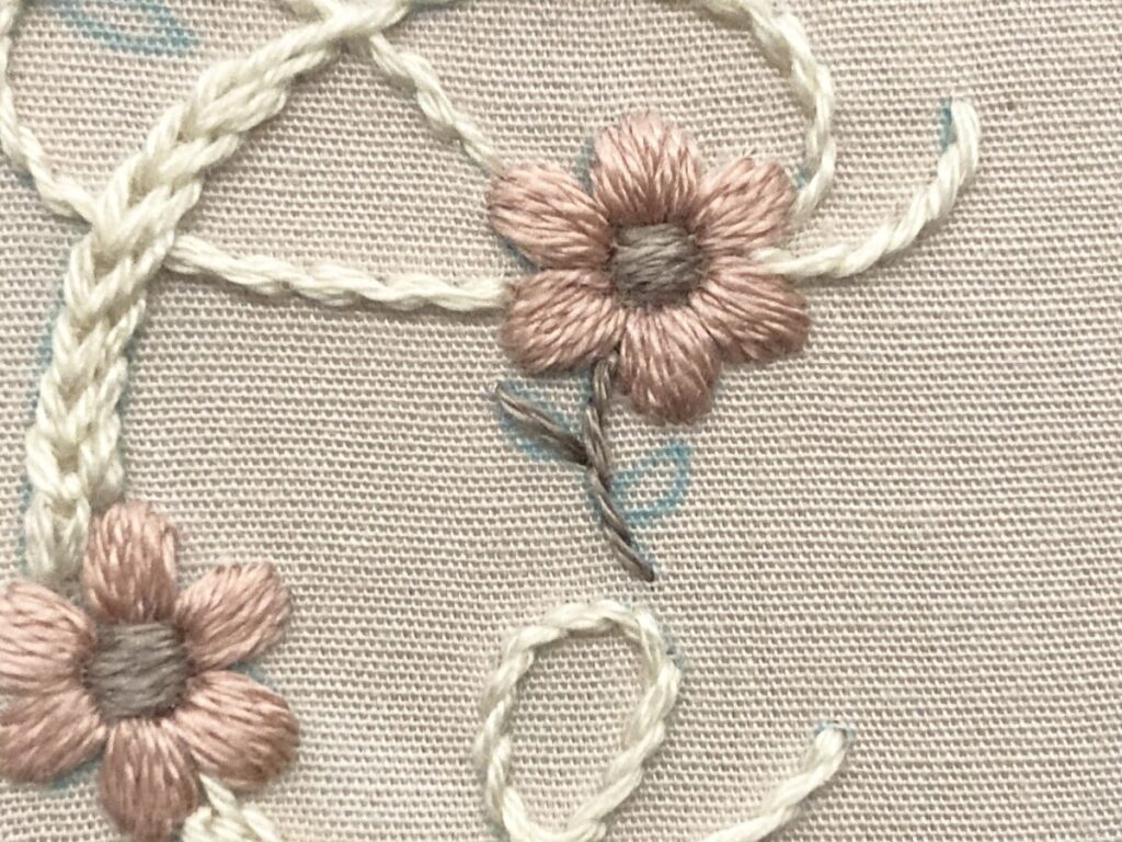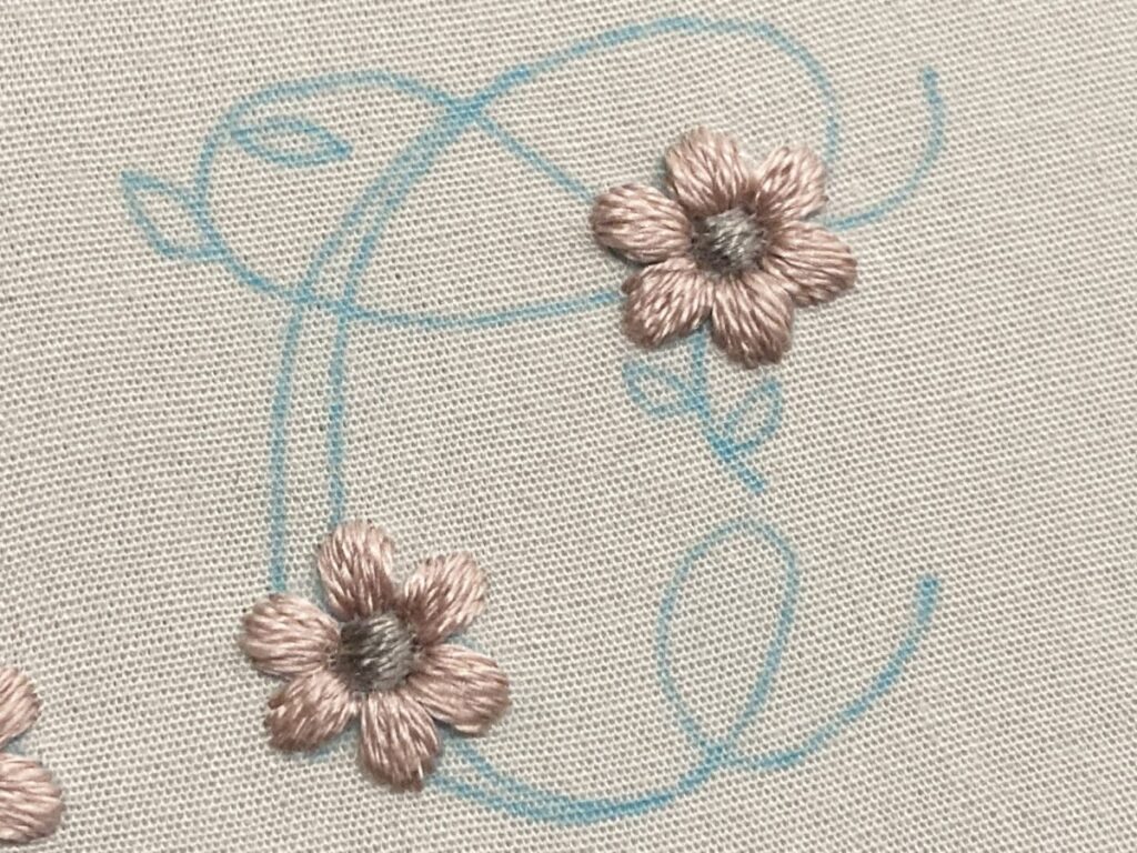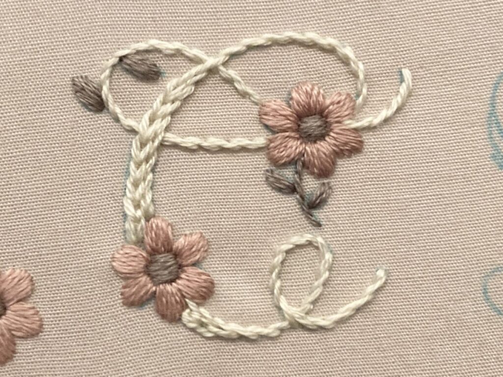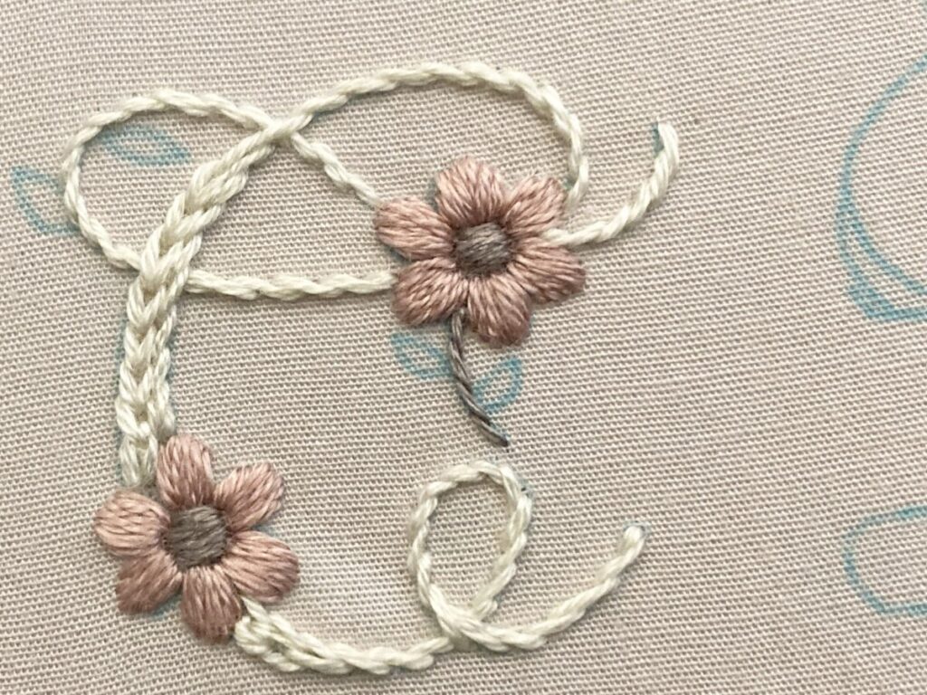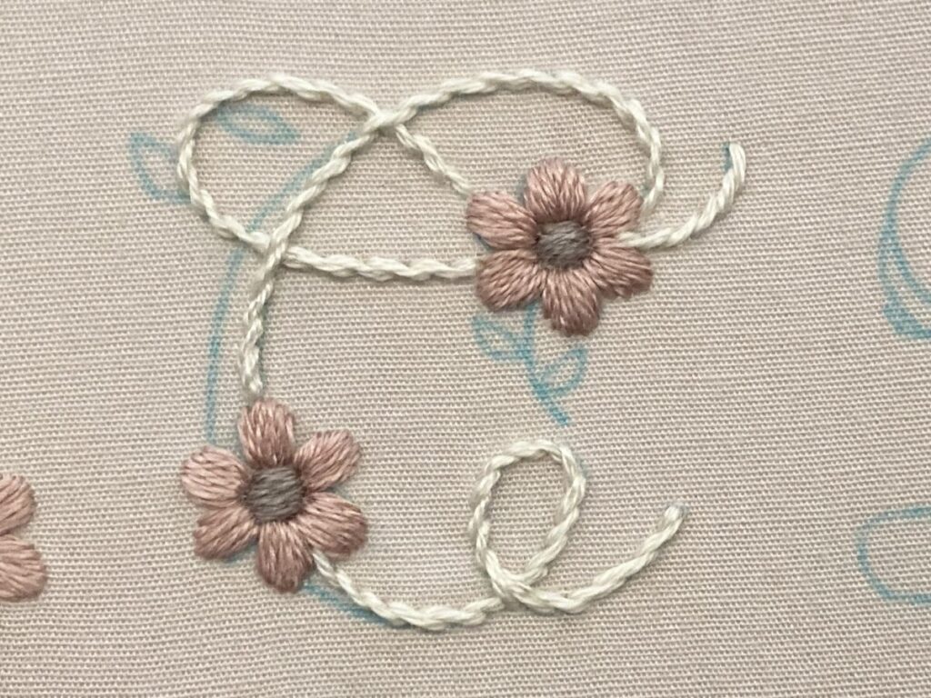 アルファベットを3本取りのアウトラインステッチで刺します。