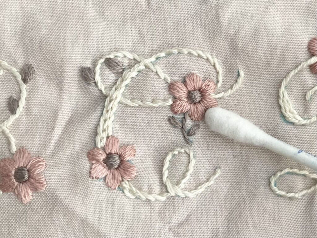 アイロン台と布の間にタオルを敷いて、刺繍した面を下にしてかけると、刺繍が潰れすぎず仕上がりがきれいです。布を軽く引っ張りながらかけて、しわが取れたら完成です!