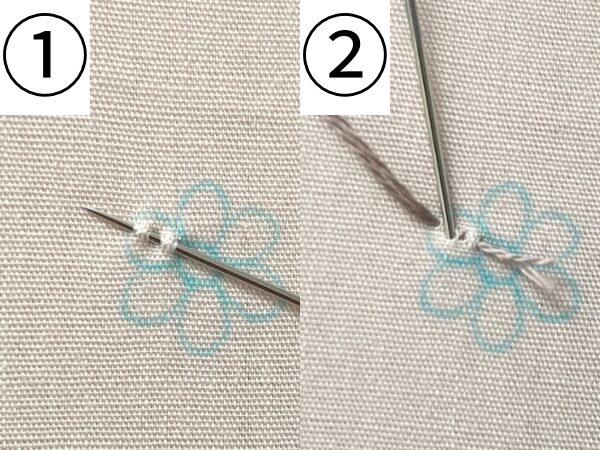 布の上から針を刺して、小さな並縫いを2目入れ、糸をぎりぎりまで引きます。糸の端を少し残して1つ前の穴に刺すと糸が絡まってとまるので、出ている糸を切ってください。(裏に玉結びがあると針が引っかかって刺繍しにくいため、この方法がおすすめです。)